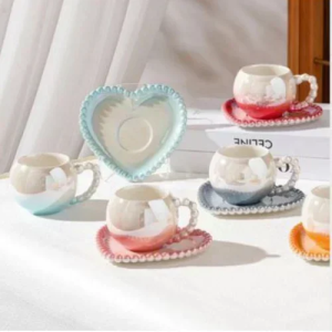 Add a touch of elegance and charm to your coffee or tea moments with this heart-shaped iridescent ceramic mug set. Featuring a beautifully crafted heart-shaped saucer and a pearl-inspired handle, this mug combines style and functionality in one exquisite design.