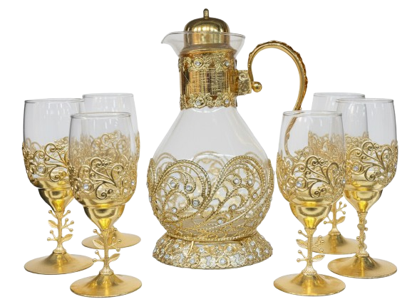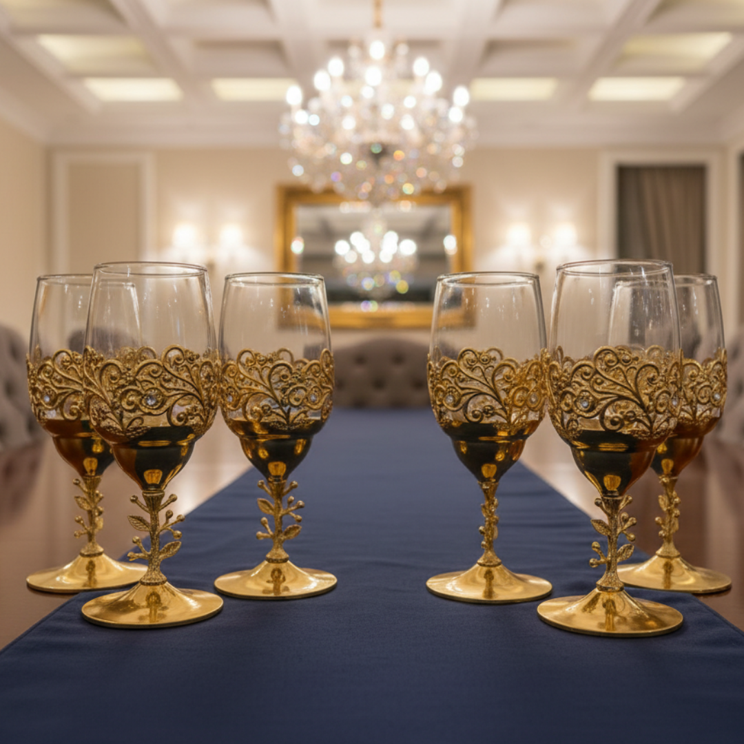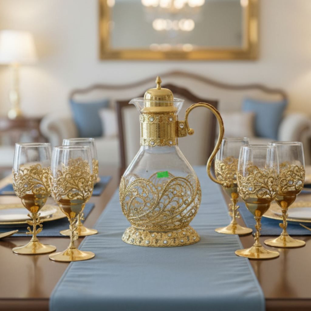 This luxury glassware set features an elegant golden leaf design that instantly enhances the look of any table setting. Whether you are serving guests, celebrating a special occasion, or enjoying daily meals, this set adds a classy and modern touch. Made from high-quality glass material, it is durable, safe, and easy to clean, ensuring long-term use without losing its shine.